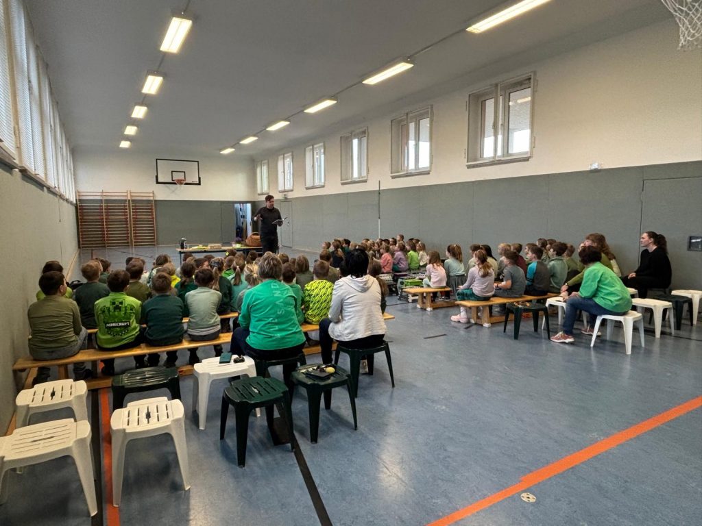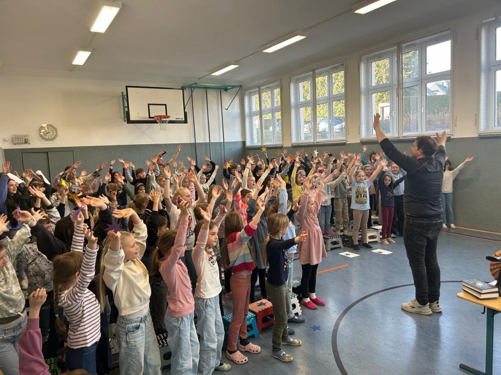 Mitten im März hat uns ein Liedermacher und Sänger aus Leipzig besucht – Dirk Preusse. Gemeinsam haben jeweils die Klassenstufen der Schule zwei tolle Stunden in der Turnhalle verbracht. Dirk Preusse hatte jede Menge Lieder zum Thema „Miteinander – Füreinander“ mitgebracht und wir durften bei allen Liedern mitmachen. So hatten alle Kinder ihren Spaß beim Tanzen und Singen zur Musik.